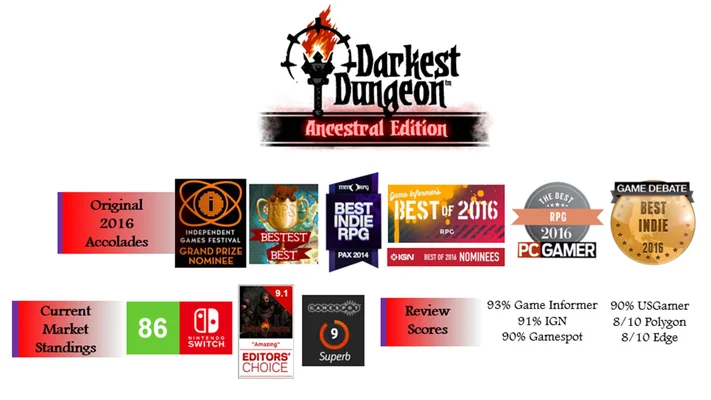 L'Ancestral Edition inclut le noyau du jeu Darkest Dungeon en plus des packs de contenu suivants : The Crimson Court et The Shieldbreaker.